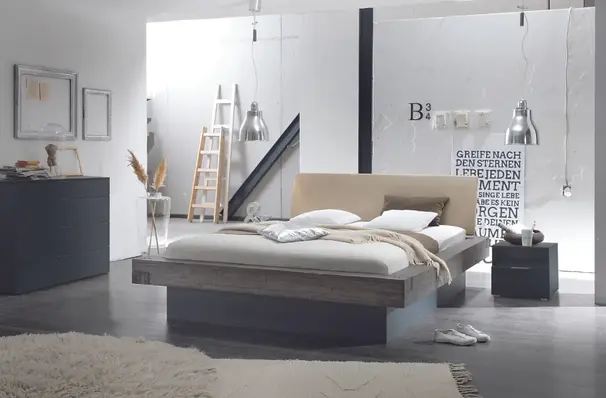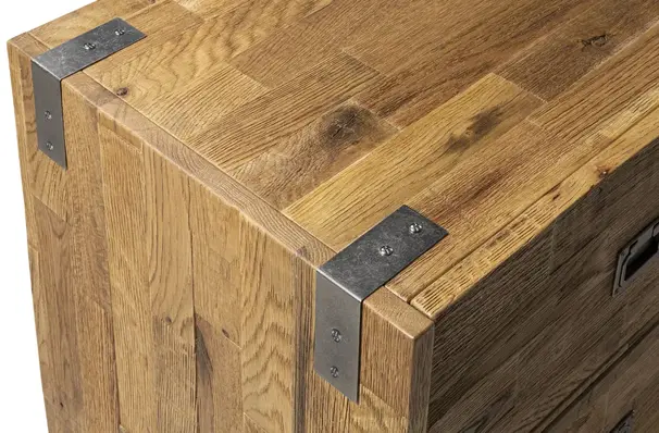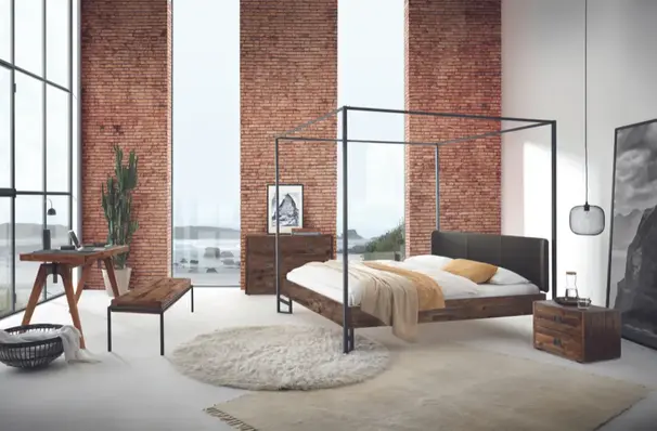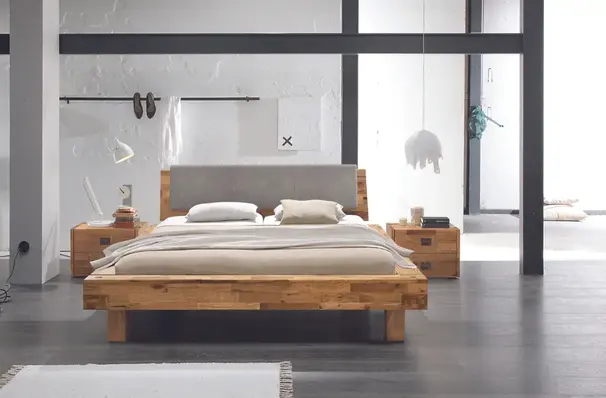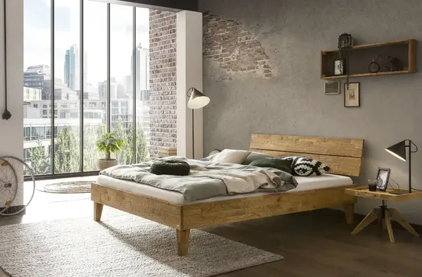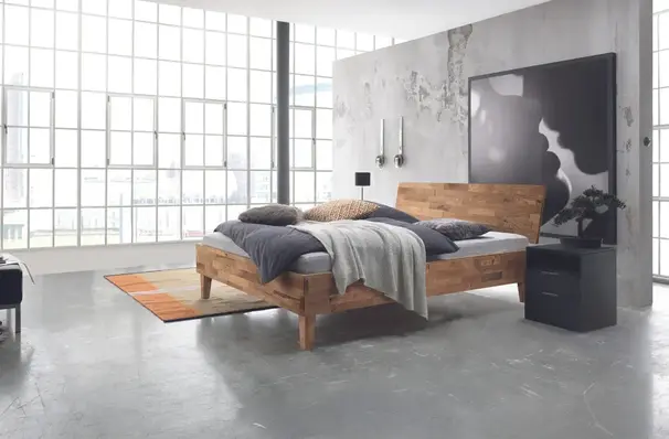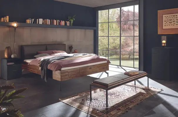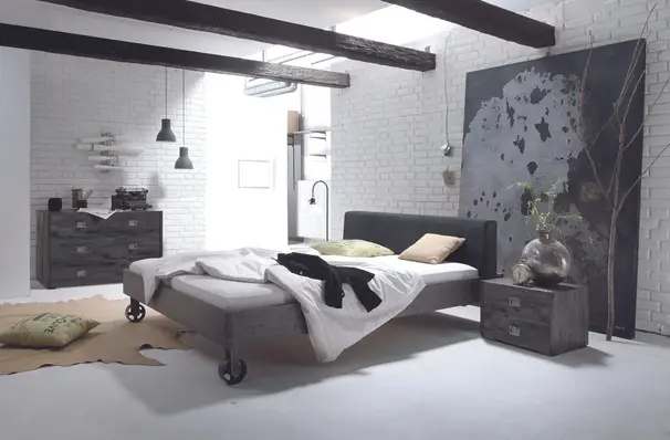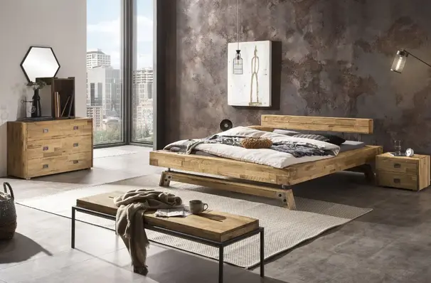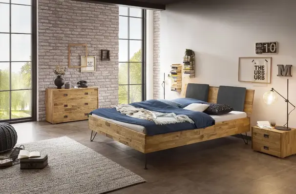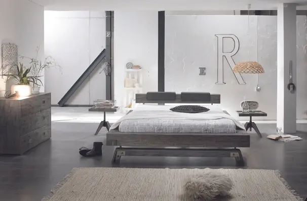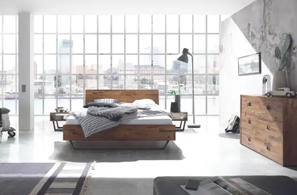 Robuste, robuste avec des ormes métalliques décoratives et des irrégularités naturelles : le style factory hall non conventionnel de notre Factory Line plonge chaque chambre à coucher dans un flair urbain extraordinaire. Pour ceux qui aiment les choses un peu plus robustes et pour ceux qui veulent renoncer aux couleurs de bois conventionnelles dans la chambre à coucher, nous offrons ce petit plus dans votre oasis de sommeil avec notre bois d'acacia spécialement traité. La surface du bois d'acacia massif est collée de manière irrégulière, ce qui lui confère un aspect d'usine unique.